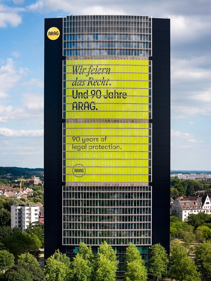Zum 90. Geburtstag startet die ARAG eine umfassende Jubiläumskampagne. Den Auftakt bildet eine bundesweite Plakataktion auf über 40.000 Flächen. Drei aufmerksamkeitsstarke Motive vermitteln mit einem Augenzwinkern die langjährige Rechtsschutz-Kompetenz des Unternehmens. Ein besonderer Blickfang ist der ARAG Tower selbst: Seit dem Jubiläumstag zeigt sich das 125 Meter hohe Düsseldorfer Wahrzeichen auf einer Fassadenseite mit seinem über 1.700 Quadratmeter großen Jubiläumsmotiv „Wir feiern das Recht. Und 90 Jahre ARAG“. „Damit präsentieren wir das weltweit wahrscheinlich größte Rechtsschutzplakat“, unterstreicht Dr. Renko Dirksen. Ergänzend stellt die ARAG auf ihrer zentralen Jubiläums-Website „Moments of Trust“ Videos vor, in denen Kunden und Geschäftspartner aus zwölf Ländern erzählen, warum sie sich in wichtigen Momenten für die ARAG entschieden haben.