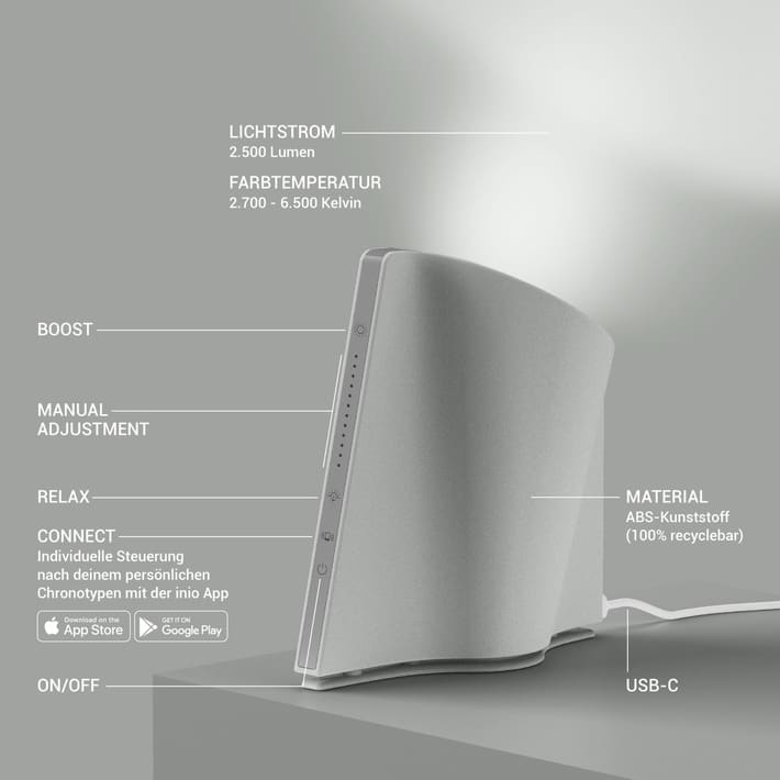 Wissenschaftliche Studien aus der Luftfahrtforschung haben gezeigt: Helligkeit und Farbtemperatur des Umgebungslichts beeinflussen maßgeblich, wie wach und leistungsfähig wir uns fühlen. inio one ist die neue Tageslichtlampe, mit der man per App seine Leistungs- und Ruhephasen für den persönlichen Tagesablauf optimieren kann.