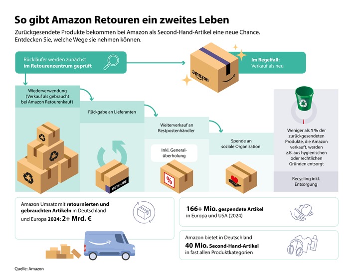 – Amazon Retourenkauf bietet gebrauchte und geöffnete Produkte zu reduzierten Preisen an. Diese Artikel werden vor dem Wiederverkauf einer gründlichen Prüfung unterzogen und mit Beschreibungen wie „Neuwertig“, „Sehr gut“, „Gut“ oder „Akzeptabel“ versehen, damit Kund:innen eine fundiertere Kaufentscheidung treffen können. Die Preise spiegeln den Zustand jedes Artikels wider.