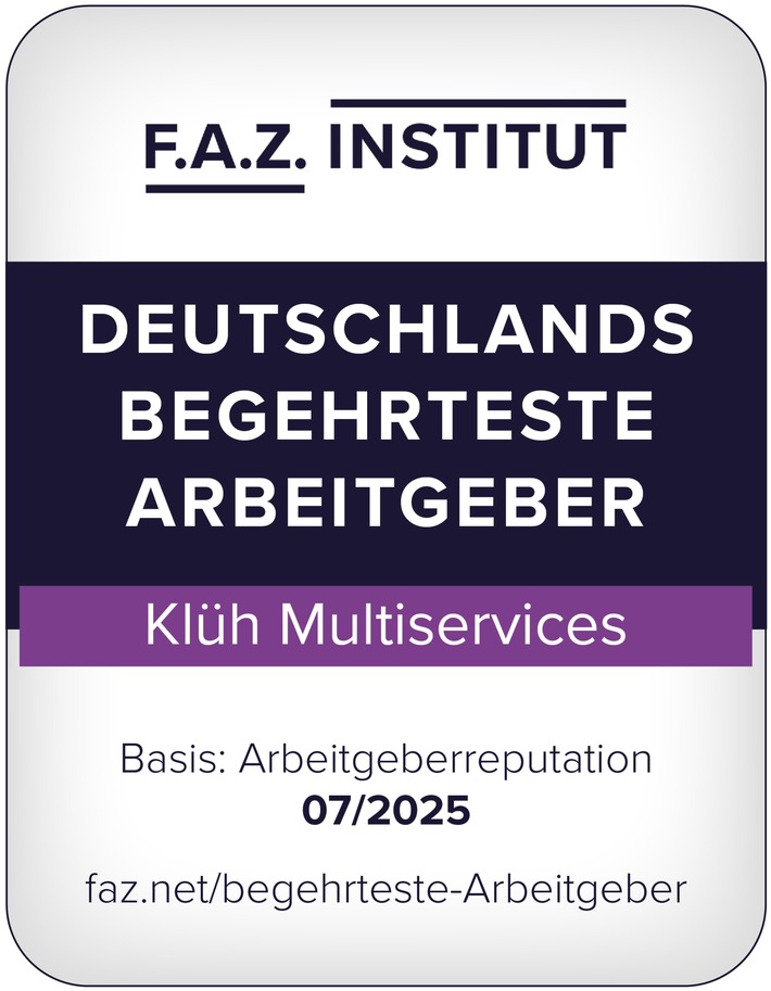 Der Multiservice-Anbieter Klüh zählt auch 2025 wieder zu den gefragtesten Arbeitgebern. In der aktuellen Studie „Deutschlands begehrteste Arbeitgeber 2025“ des F.A.Z.-Instituts und des Instituts für Management- und Wirtschaftsforschung belegt das Düsseldorfer Familienunternehmen Platz 1 (https://servicevalue.de/rankings/facility-manager-14/) in der deutschen Facility-Management-Branche.