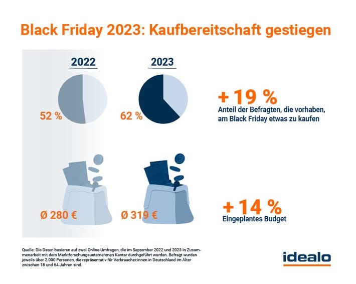 Laut der idealo Umfrage planen knapp zwei Drittel (62 Prozent) der Befragten, am diesjährigen Black Friday auf Schnäppchenjagd zu gehen – und damit wieder mehr Menschen als im Vorjahr. 2022 hatte nur rund die Hälfte (52 Prozent) der Studienteilnehmer:innen angegeben, am Black Friday einkaufen zu wollen. Auch das maximal veranschlagte Budget steigt wieder. Lag der Durchschnittsbetrag 2022 noch bei 280 Euro, so rechnen Konsument:innen am diesjährigen Black Friday im Schnitt mit Ausgaben in Höhe von 319 Euro. Das entspricht einem Anstieg von 14 Prozent [2].