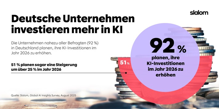 Deutsche Unternehmen investieren deutlich mehr in KI, wie eine aktuelle Studie des Technologieberatungsunternehmens Slalom unter 2000 Befragten weltweit und 161 Befragten in Deutschland zeigt. Demnach planen 92 Prozent der befragten Führungskräfte, ihre KI-Investitionen 2026 gegenüber 2025 zu erhöhen. Die Mehrheit (51 Prozent) plant Mehrausgaben von mehr als 25 Prozent. 46 Prozent wollen ausgewogen investieren, 20 Prozent ROI-getrieben und 16 Prozent aggressiv. Weitere 16 Prozent möchten investieren, um zu testen und zu lernen. „Der Investitionswille in KI-Technologien ist ein äußerst positives Signal. Doch Technologie und Mitarbeiterbefähigung sollten auf eine gut abgestimmte Strategie folgen, nicht umgekehrt. KI-Projekte sind nur dann erfolgreich, wenn sie mit konkreten Geschäftswerten und Mitarbeiterbefähigung umgesetzt werden. So entstehen nachhaltige Ergebnisse statt teurer Experimente“, erklärt Denis Gassmann, Geschäftsführer von Slalom Germany.