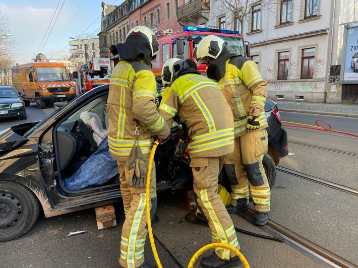 Bei einem Verkehrsunfall ist am heutigen Morgen eine 56-jährige Fahrerin verletzt und in ihrem Fahrzeug eingeklemmt worden. Die Kräfte des Rettungsdienstes waren zuerst vor Ort und leiteten die medizinische Erstversorgung ein. Durch die Feuerwehr wurden zunächst die Einsatzstelle und das Fahrzeug gesichert. Dazu musste die Leipziger Straße voll gesperrt werden, was Auswirkungen auf den morgendlichen Berufsverkehr sowie den ÖPNV der Dresdner Verkehrsbetriebe hatte. Nach Abschluss der Lageerkundung wurde nach Rücksprache mit dem Notarzt die technische Rettung der eingeklemmten Frau eingeleitet. Dazu wurde eine sogenannte große Seitenöffnung geschaffen. Das bedeutet, dass die Türen und die B-Säule der linken Fahrzeugseite mit hydraulischen Rettungsgeräten entfernt werden mussten, um die Patientin so schonend wie möglich zu befreien. Nach der erfolgreichen Rettung erfolgte mit Notarztbegleitung der Transport in ein Krankenhaus. Die Polizei hat die Ermittlungen zur Unfallursache aufgenommen. Im Einsatz waren 24 Einsatzkräfte der Feuer- und Rettungswachen Albertstadt und Übigau, der Rettungswachen Neustadt und Pieschen sowie der B-Dienst.