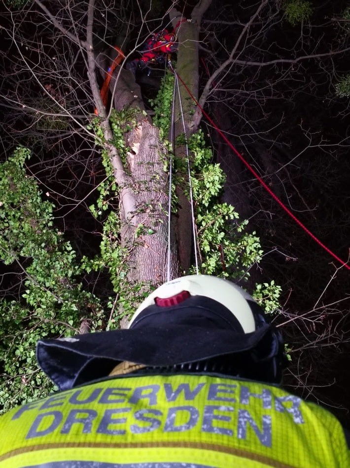 Ein circa 80 Zentimeter starker Baum war sturmbedingt gegen einen Nachbarbaum gedrückt worden. In etwa sechs Metern Höhe war ein etwa 25 Meter langer Ast abgebrochen und drohte auf ein Wohngebäude zu stürzen, in welchem 12 Mietparteien leben. Einige kleinere Äste waren bereits auf den Gehweg und das benachbarte Grundstück gefallen. Auf Grund der ungünstigen Lage des Baumes war es nicht möglich den Baum abzutragen und die Gefahr zu beseitigen. Durch Mitarbeiter der Höhenrettungsgruppe wurden unter Anwendung von Baumseilklettertechniken zwei Bandschlingen an besagtem Ast befestigt. Mit einem Stahlseil und einem Greifzug erfolgte die Sicherung des Astes. Mit der Seilwinde des Rüstwagen-Kran konnte dann der Ast kontrolliert vom Gebäude weggezogen und damit die Gefahr gebannt werden. Verletzt wurde niemand. Im Einsatz waren 18 Einsatzkräfte der Feuer- und Rettungswachen Albertstadt, Altstadt und Löbtau.