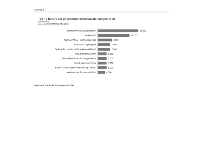 Gerade in Berufen, die nicht so viele Jugendliche im Fokus haben sind noch zahlreiche Ausbildungsstellen unbesetzt. Fast 42.000 unbesetzte Ausbildungsstellen gibt es in Verkaufsberufen (ohne Spezialisierung), 19.000 in Hoch-, Tief-, und Ausbauberufen, 16.000 in Mechatronik, Energie- und Elektrotechnikberufen, jeweils etwa 11.000 in Lagerlogistikberufen und Berufen in Lebensmittelherstellung und -verkauf. Auch in Metallberufen, Hotel- und Gaststättenberufen (inkl. Köche) und in Maschinenbau- und Betriebstechnikberufen sind noch viele Ausbildungsstellen frei.