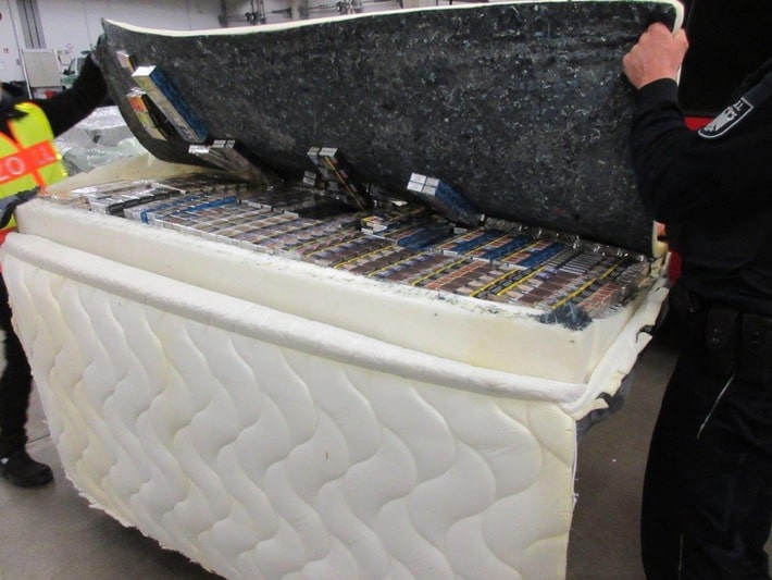 Daraufhin wurde eine Matratze geöffnet und zum Vorschein kamen die ersten unversteuerten Zigaretten. Am Ende stellte sich heraus, dass sechs der geladenen acht Matratzen komplett mit Zigaretten ausgefüllt waren. Insgesamt zählten die Beamten knapp 165.000 Zigaretten!