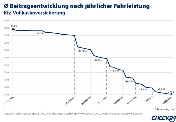 Eine Beispielberechnung für eine Vollkaskoversicherung über alle im CHECK24 Kfz-Versicherungsvergleich verfügbaren Tarife zeigt, dass der durchschnittliche Beitrag mit abnehmender Fahrleistung stufenförmig sinkt.1) Viele Versicherer nutzen zur Beitragsberechnung einheitliche Kilometergrenzen. Verbraucher*innen sparen beim Kfz-Versicherungsbeitrag, wenn sie die Fahrleistung nicht zu großzügig einschätzen.