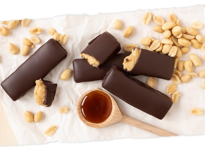 Gefüllt mit knackigen Erdnüssen und cremigem Karamell, ist der Choc Bar eine nachhaltige Alternative zu einem der beliebtesten Erdnuss-Schokoriegel Deutschlands. Die technologische Herausforderung, Karamell ohne Butter herzustellen und dennoch eine cremige Konsistenz zu erhalten, wurde erfolgreich von der Innovationsmarke Veganz gemeistert. Der Riegel enthält ausschließlich hochwertige Zutaten in Bio-Qualität und ist frei von Palmöl. Mit 18g sind im Vergleich zum konventionellen Klassiker mehr als doppelt so viele Proteine enthalten – damit ist der Riegel ebenfalls eine ausgezeichnete Proteinquelle. Zudem kommt er im direkten Vergleich mit einem Drittel weniger Zucker aus.