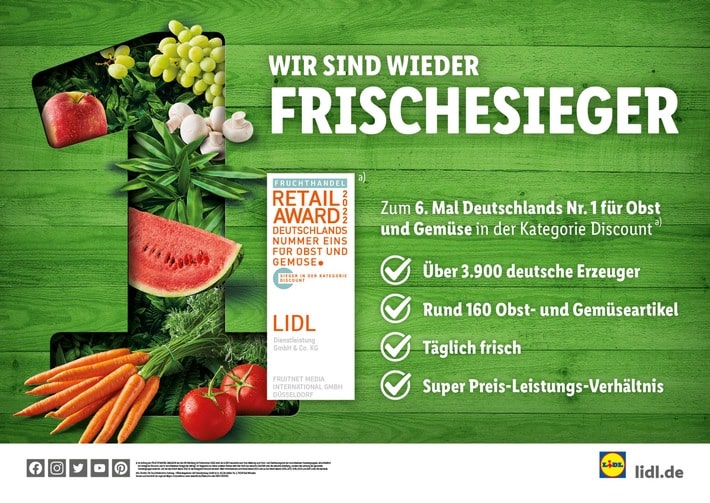 Diesen erneuten Erfolg feiert Lidl in den kommenden Wochen unter anderem in TV- und Radio-Spots. Ebenfalls bewirbt das Unternehmen seinen Frischesieg im Haushaltshandzettel, in den Filialen und klassisch in Zeitungsanzeigen.