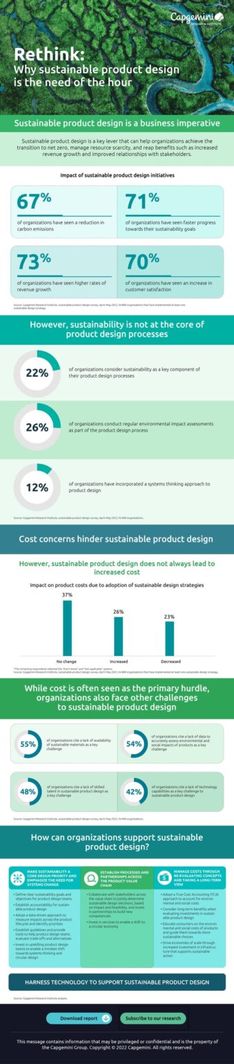 Unternehmen müssen Nachhaltigkeit in ihren Produktentwicklungsprozessen verankern, wenn sie das Ziel von Netto-Null-Emissionen erreichen wollen. Das gilt insbesondere für den entlang der Wertschöpfungskette indirekt verursachten CO2-Ausstoß (Scope-3-Emissionen[1]). Mehr als zwei Drittel der Unternehmen mit nachhaltigen Produktdesign-Strategien konnten ihre Kohlendioxidemissionen verringern, und fast drei Viertel verzeichneten Umsatzsteigerungen. Zu diesen Ergebnissen kommt die neue Studie „Rethink: Why sustainable product design is the need of the hour (https://www.capgemini.com/de-de/news/studie-unternehmen-profitieren-von-nachhaltigem-produktdesign-senkung-von-co2-emissionen-und-kosten/)“ des Capgemini Research Institute (https://www.capgemini.com/insights/research-institute/). Die Untersuchung zeigt, dass es für Unternehmen vielversprechend ist, diese Initiativen zu auszuweiten. Der erste Schritt kann darin bestehen, Nachhaltigkeit als strategische Priorität der Produktdesign-Teams zu definieren.