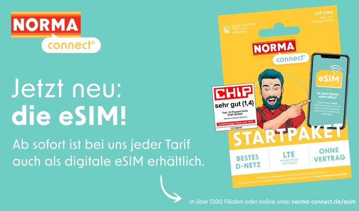 Der Smartphone-Tarif von NORMA ist jetzt auch über die noch nachhaltigere eSIM erhältlich! Kundinnen und Kunden, die die Top-Tarife für wenig Geld nutzen, können ab sofort umsteigen – die bisherige SIM-Karte aus Plastik gehört dann der Vergangenheit an. Die Einrichtung des Smartphones mit der eSIM geht noch schneller und einfacher: Sie findet komplett digital statt und ist von unterwegs aus möglich. Flexibler und nachhaltiger sind Userinnen und User noch nie in die Welt von NORMA Connect abgetaucht.