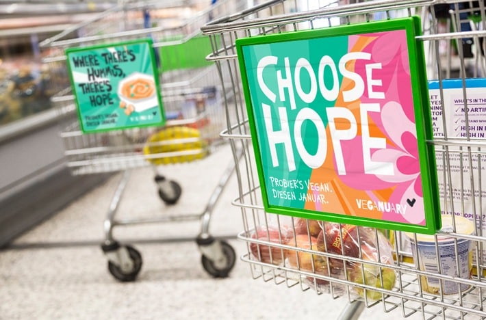 Beim Einkauf: Im Supermarkt und Discounter führt kein Weg am Veganuary vorbei. Die großen Handelsketten (u. a. Edeka, Rewe, Aldi Nord und Süd, Penny, Lidl, Kaufland, Globus) bieten eine Vielzahl an Aktionen, Sonderangeboten und neuen Produkten, die offensiv beworben werden. Eines von vielen Highlights: Aldi führt ein veganes Steak ein.