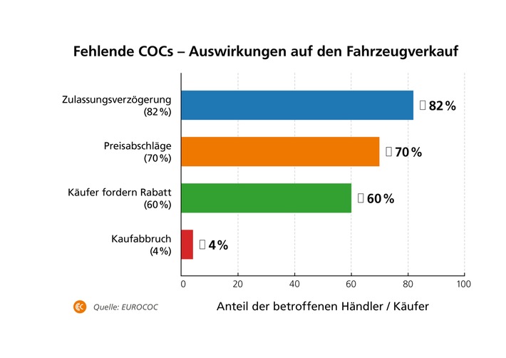 82 % der Befragten berichten von Zulassungsverzögerungen um zwei Wochen oder mehr, wenn das COC fehlt. Ganze 4 % der potenziellen Käufer haben angegeben, dass sie einen Kauf ablehnen, wenn kein COC vorhanden ist und sie die aufwendige Nachbeschaffung selbst übernehmen müssten.
