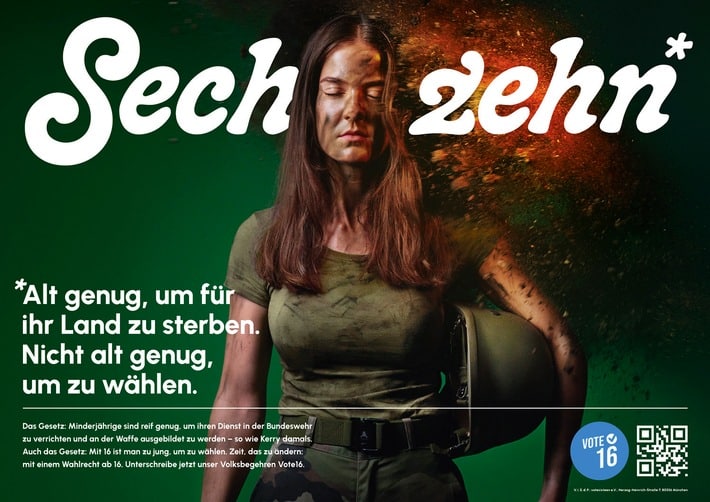 „Alt genug, um für ihr Land zu sterben. Nicht alt genug, um zu wählen.“ Kerry Hoppe aus München entschied sich noch als Minderjährige für den Dienst in der Bundeswehr und startete mit 17 Jahren ihre Ausbildung als Reserveoffizierin bei der Luftwaffe. Die heute 22-jährige Soldatin war damals per Gesetz alt genug, um beruflich an der Waffe ausgebildet zu werden und für ihr Land einzustehen. Allerdings zu jung, um zu wählen. Kerry Hoppe ist Mitgründerin von Vote16: „Als Minderjährige hat mir der Gesetzgeber den Dienst an der Waffe bei der Bundeswehr zugetraut, nicht aber die Wahlentscheidung. Diese Absurdität hat mich zu Vote16 gebracht und genau dieser Absurdität wollen wir mit unserer Kampagne ein Gesicht verleihen.“