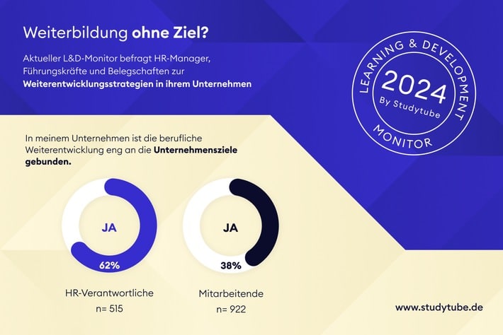 Viele Arbeitgeber entwickeln ihre Mitarbeitenden an ihren Unternehmenszielen vorbei. Das ist ein Ergebnis des aktuellen „Learning & Development Monitors“, einer repräsentativen Studie für die das HR-Unternehmen Studytube bundesweit 1.799 Beschäftigte, davon 515 HR-Manager, 362 Führungskräfte sowie 922 Mitarbeitende, befragen ließ. Demnach behaupten zwar 62% der HR-Verantwortlichen, dass die Weiterbildung in ihrem Unternehmen fest mit den Zielen des Unternehmens verbunden sei. Das bestätigen allerdings nur 38% der Mitarbeitenden sowie etwas mehr als die Hälfte der Führungskräfte (54%). Hinzu kommt: Während 46% der Personaler:innen für das Jahr 2024 die persönliche Entwicklung ihrer Mitarbeitenden in den Fokus ihrer Weiterentwicklungsstrategie stellen, wünschen sich 77% der Mitarbeitenden vor allem eine fachliche Weiterbildung. Bei den Führungskräften sprechen sich gar 85% für Maßnahmen aus, die ihre fachlichen Fähigkeiten in den Blick nimmt.